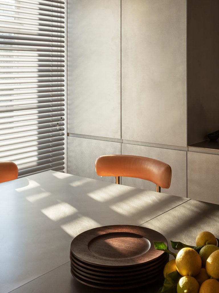 用餐空間以暖色系為基調,營造出一個溫馨舒適的家庭聚餐環境。百葉窗的設計既能靈活調節光線,又增添了空間的私密性和舒適感。當陽光透過百葉窗灑進室內,整個用餐區域變得更加溫暖而宜人。